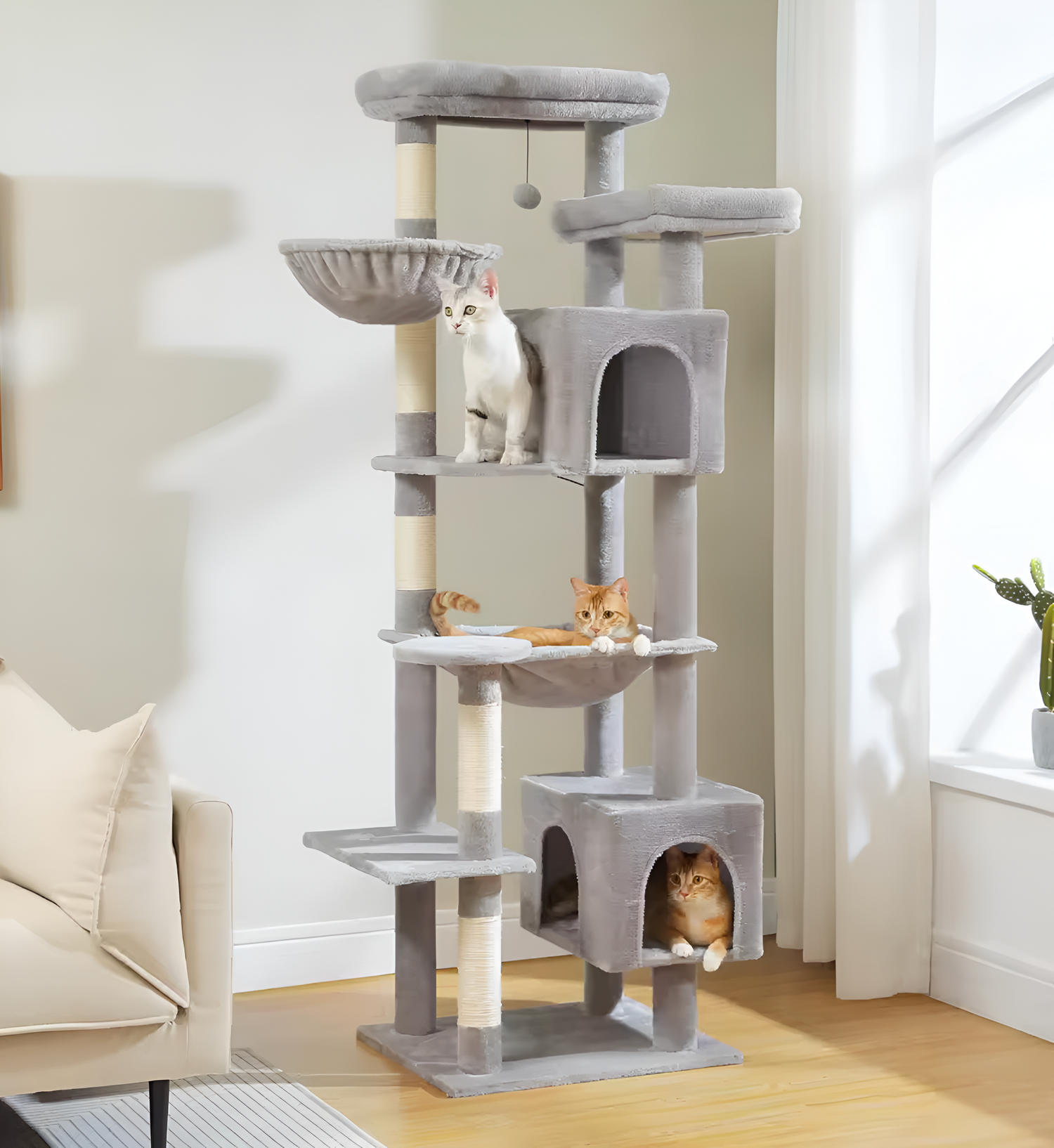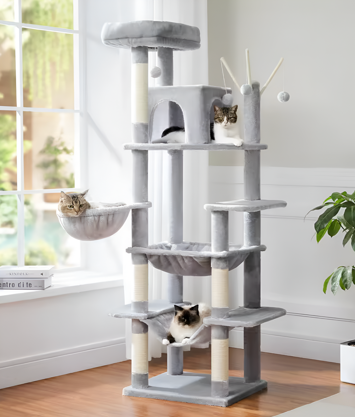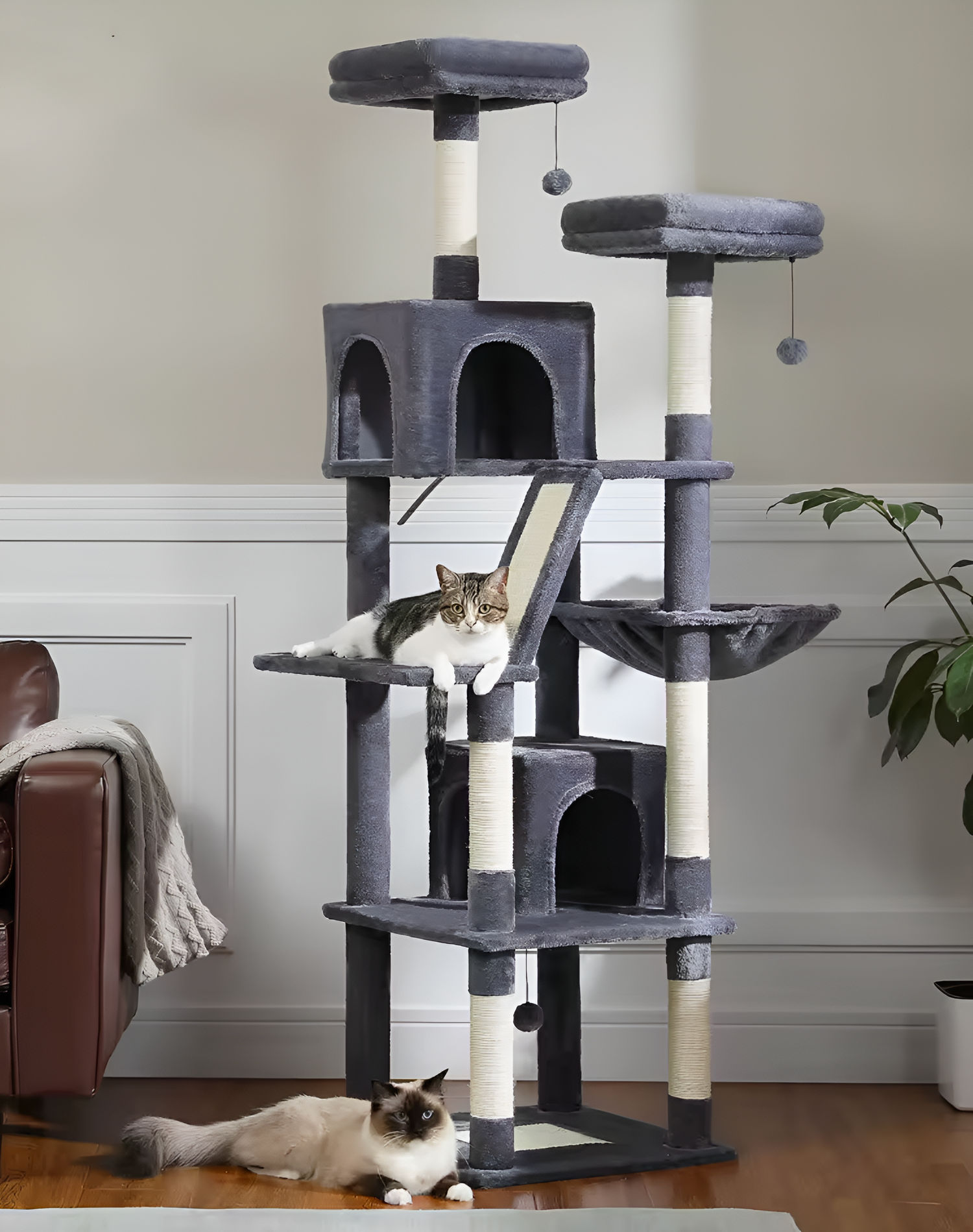 Each tower offers multiple tiers designed for climbing, resting, and exploring — ideal for cats with high energy and vertical instincts.